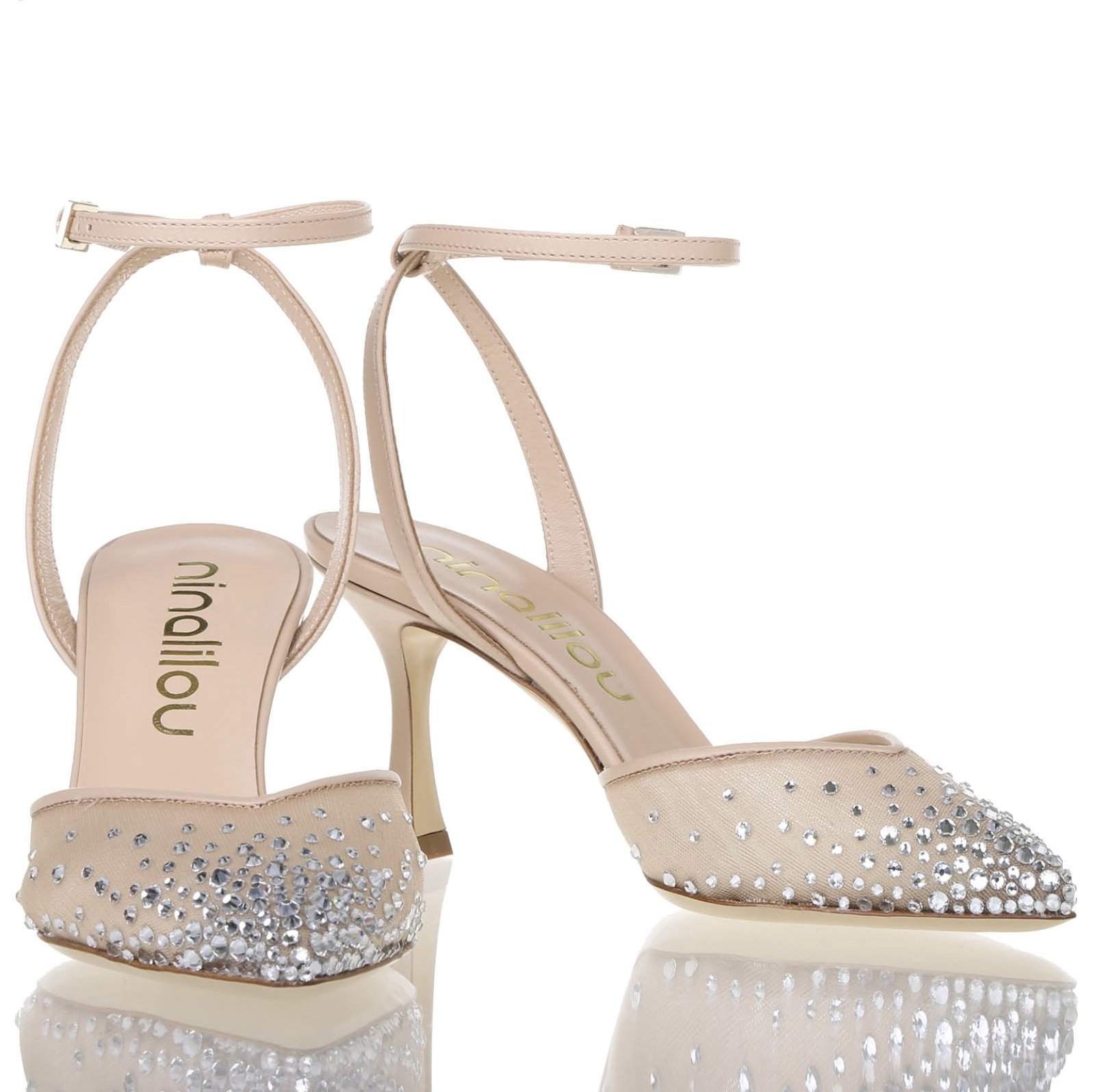 DÉCOLLETÉ IN MORBIDA NAPPA CON PUNTA IN RETE E APPLICAZIONE DI STRASS. SUOLA IN CUOIO. TACCO 7,5