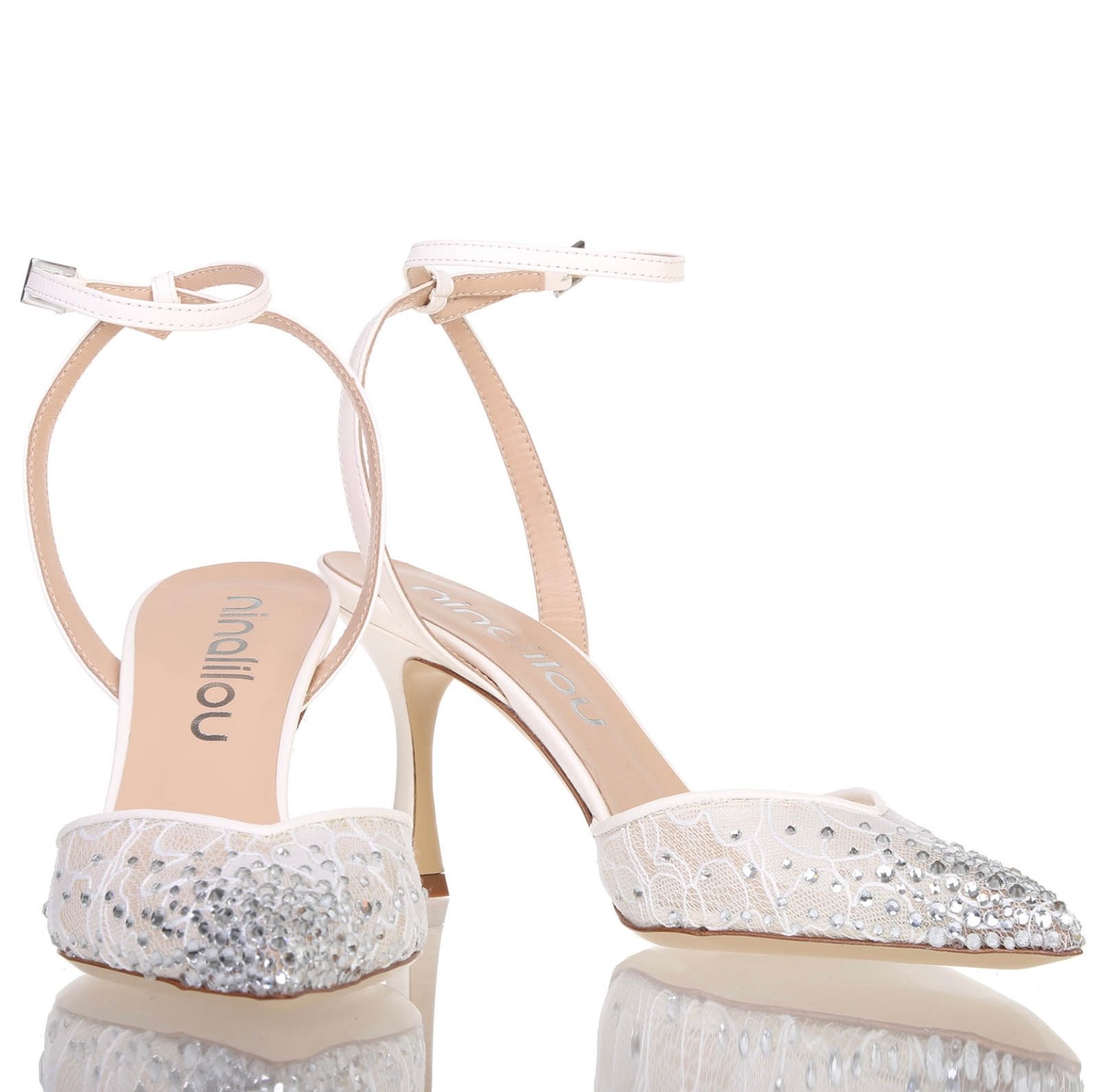 DÉCOLLETÉ CON CINTURINO ALLA CAVIGLIA, REALIZZATA PIZZO E NAPPA CON APPLICAZIONE DI STRASS. SCOLLO A PUNTA. SUOLA IN CUOIO. TACCO 7,5 CM.