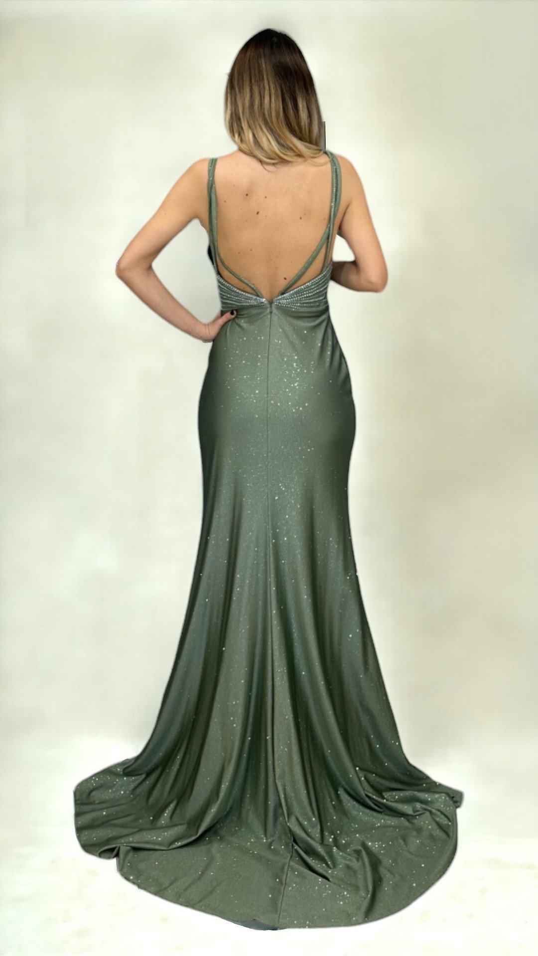 Abito da cerimonia in tessuto scintillante, perfetto per chi cerca un look elegante e seducente. Il corpino con profondo scollo a V, impreziosito da luminose applicazioni di paillettes tono su tono, esalta il décolleté con sofisticata sensualità. Le spalline sottili conferiscono leggerezza alla linea, mentre il punto vita aderente scolpisce la figura. La gonna, lunga e avvolgente, è caratterizzata da un sensuale spacco frontale e da una caduta fluida che segue i movimenti con naturalezza, terminando in un raffinato strascico.