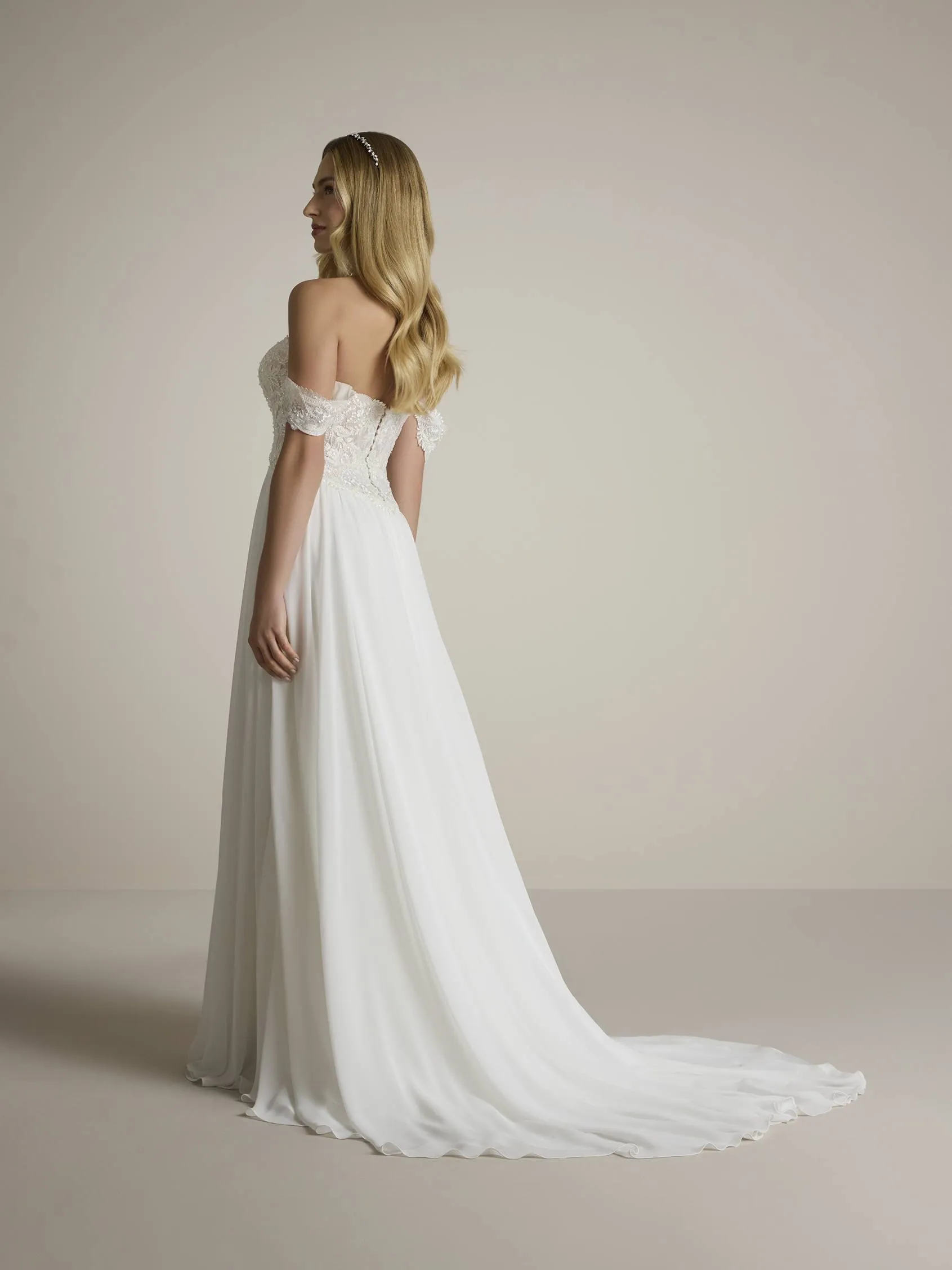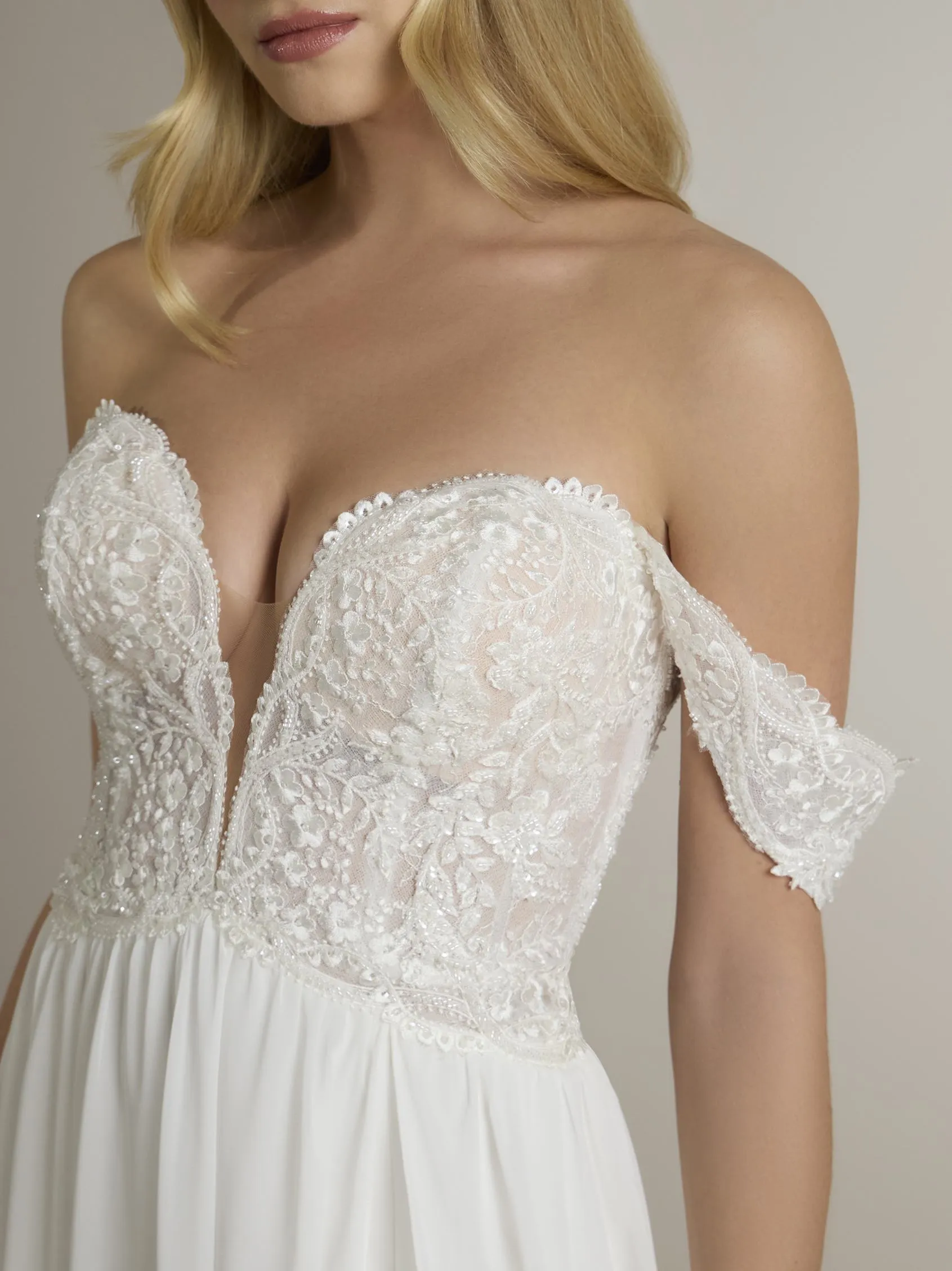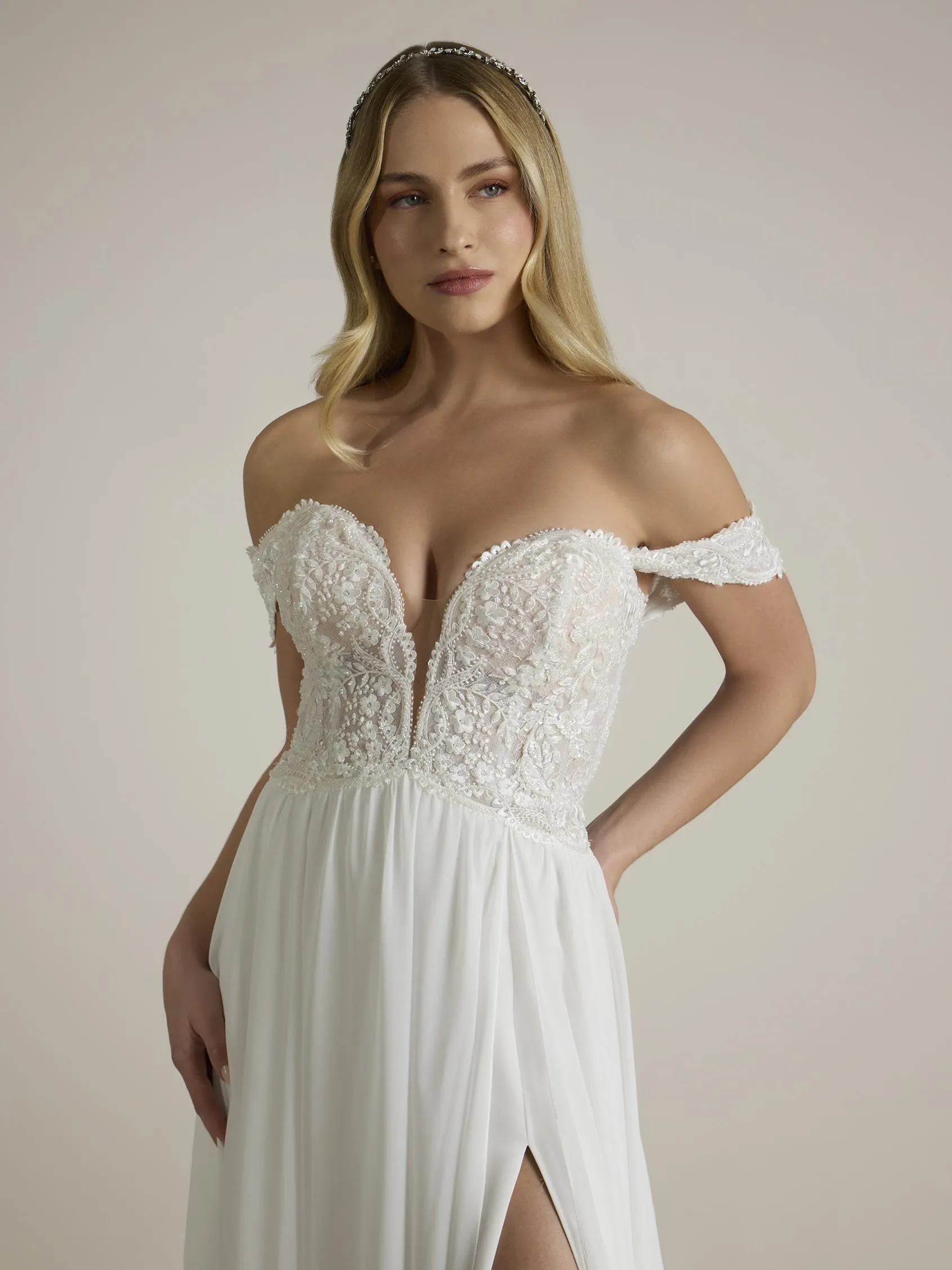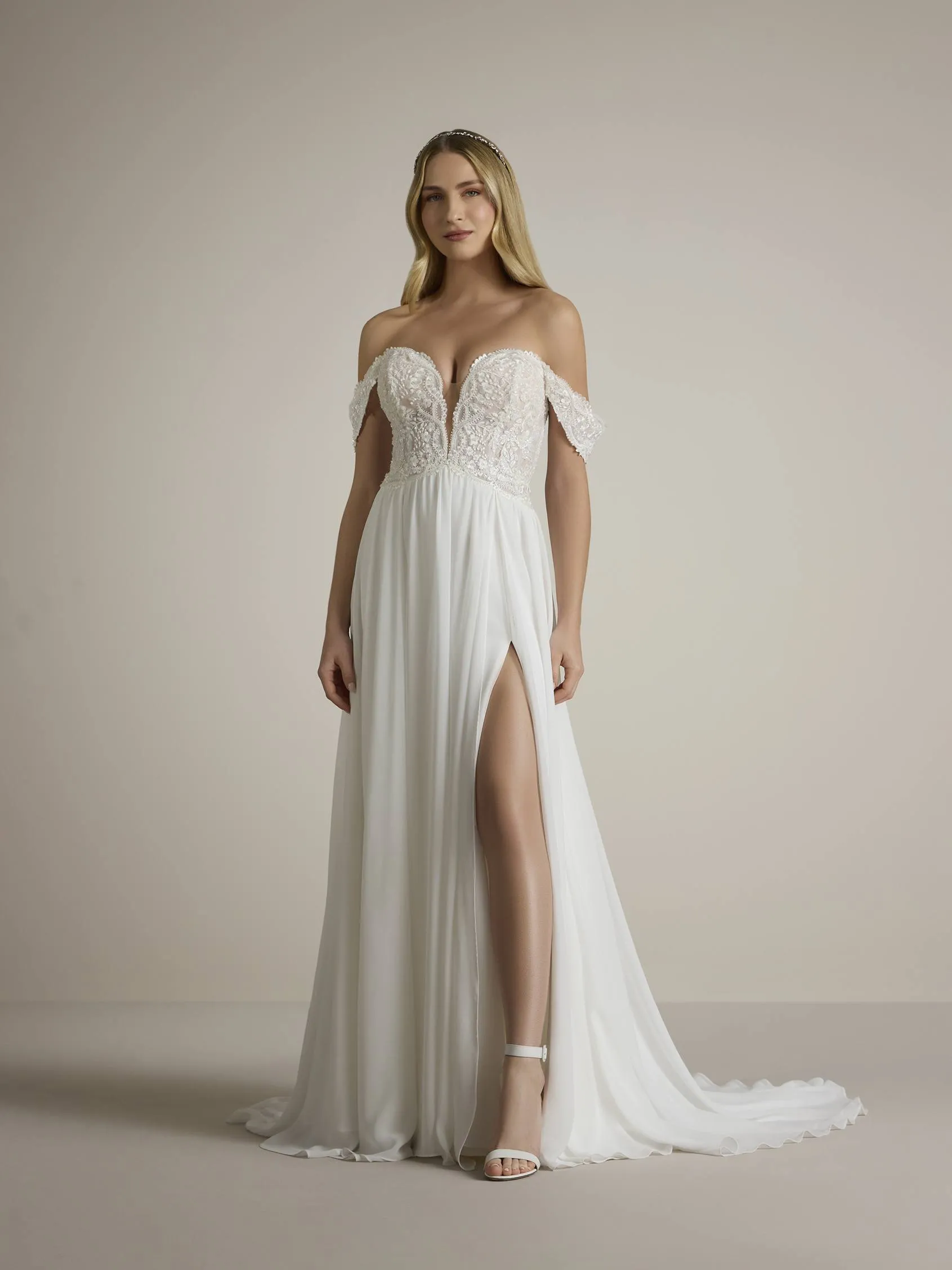 Abito da sposa fluido a trapezio con scollatura a cuore, maniche staccabili e spacco.
