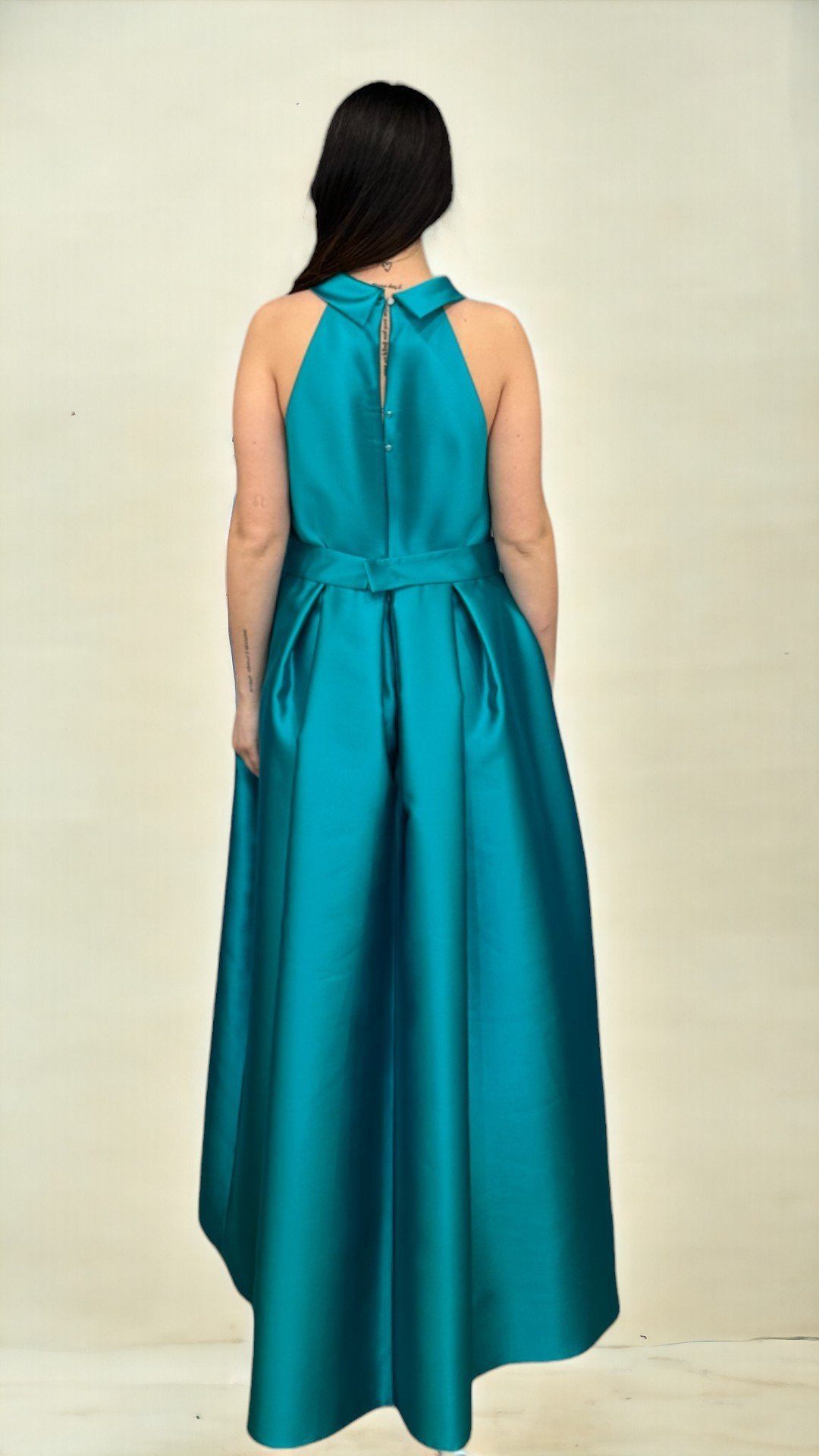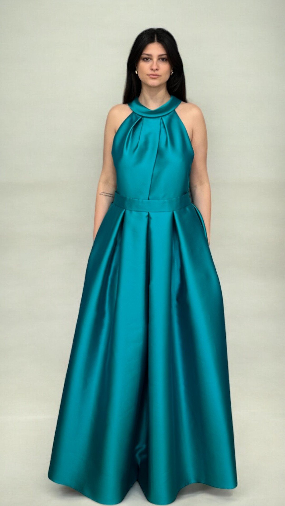 Abito da cerimonia in mikado, perfetto per chi desidera un look elegante e sofisticato. Il corpino senza maniche, caratterizzato da un raffinato scollo all’americana con drappeggio morbido, slancia la figura con un tocco moderno e sensuale. Il punto vita segnato da una cintura in tessuto sottolinea la silhouette, donando equilibrio e armonia alla linea. La gonna lunga, ampia e strutturata, realizzata in mikado lucente, cade con eleganza fino a terra, creando un effetto scenografico di grande impatto. Ideale per cerimonie ed eventi serali, questo abito unisce stile contemporaneo e classe senza tempo.