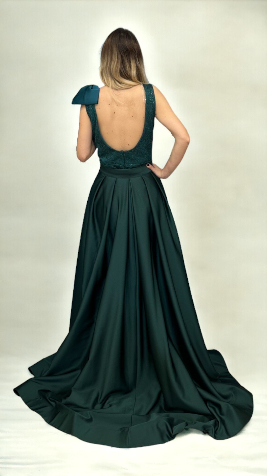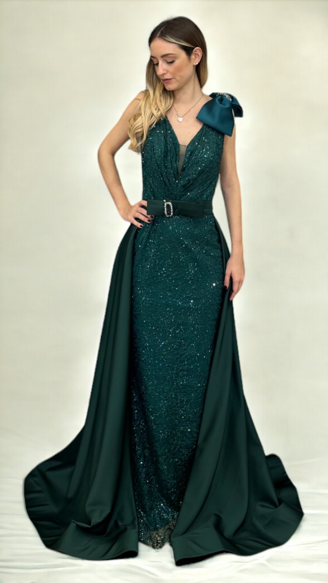 Abito da cerimonia in tessuto glitterato, pensato per chi desidera un look elegante e scenografico. Il corpino con scollo a V, impreziosito da luminosi riflessi e completato da un raffinato fiocco sulla spalla, esalta con delicatezza la linea del décolleté. La cintura in vita con fibbia gioiello valorizza la silhouette, donando definizione e armonia alle proporzioni. La gonna lunga, realizzata con un raffinato sopragonna in mikado dalla caduta strutturata, si apre in un ampio strascico che avvolge la figura con maestosità e fascino.
