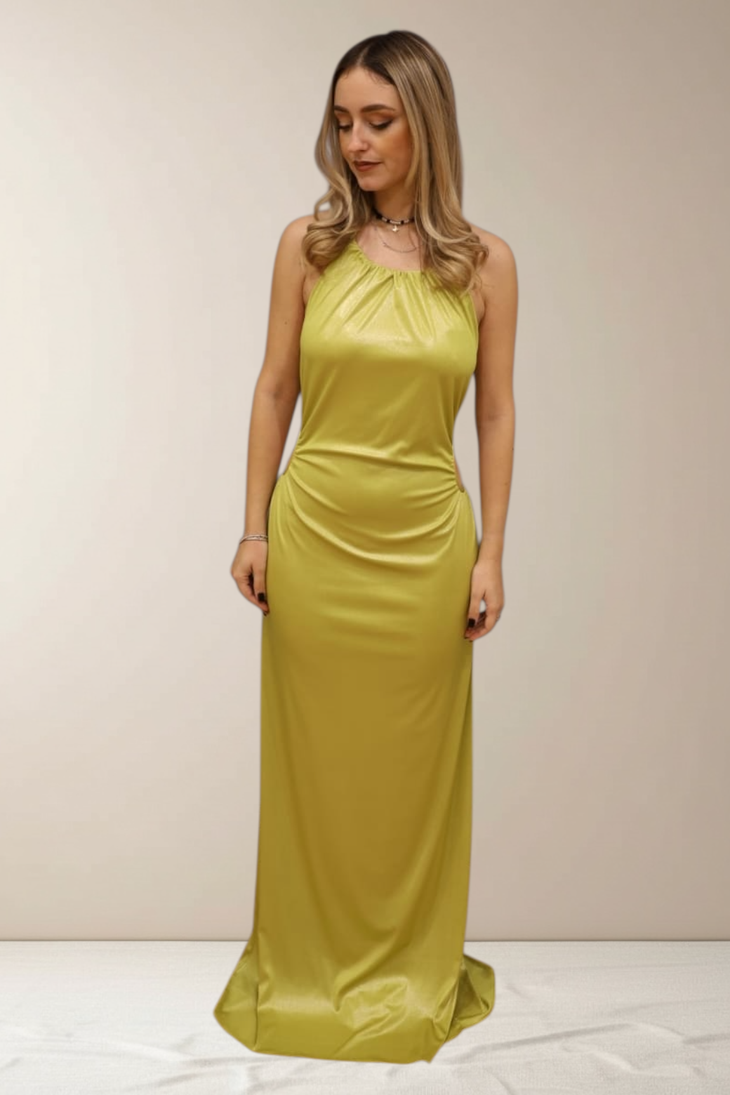 Abito da cerimonia lungo essenziale ed elegante. Il corpino con scollo all’americana leggermente arricciato valorizza il décolleté con naturale delicatezza, lasciando la schiena scoperta per un effetto sensuale e raffinato. La linea scivolata segue la silhouette con morbidezza, accompagnando i movimenti con leggerezza. Ad altezza fianchi sono presenti su ambo i lati, 2 aperture ad oblò. Inoltre è presente lo spacco nel centro dietro della gonna. Un modello minimal e femminile, ideale per cerimonie ed eventi speciali.